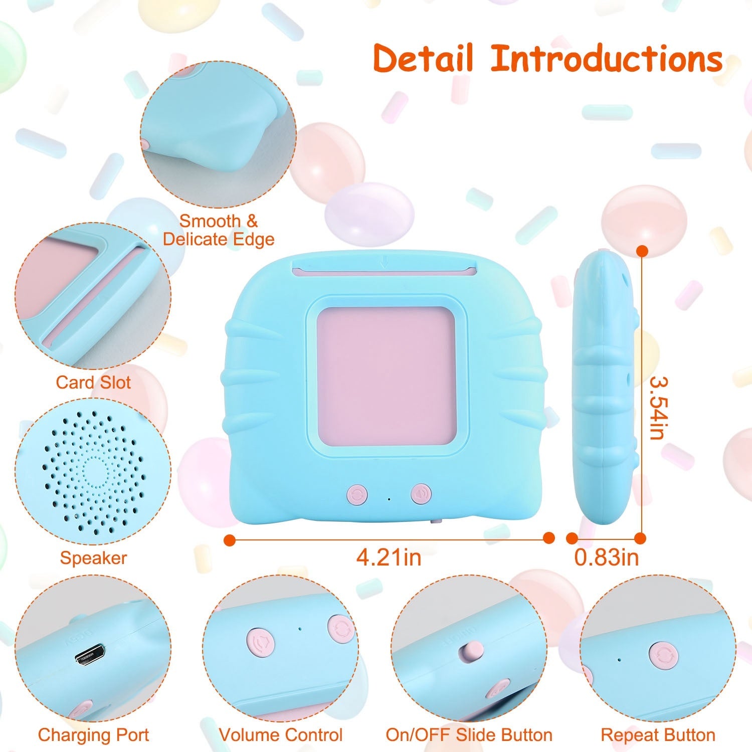 **Easy To Operate*:It's easy to insert and remove cards even for a toddler; put the cards into the reader; it will tells you what is on the card and what sound the animal/vehicle makes. No LCD display and no WiFi restriction; it will get kids away from electric devices and the TV; protect eyesight and help them learn new words with repeat function; sounds; identify pictures so as to expand their imagination.